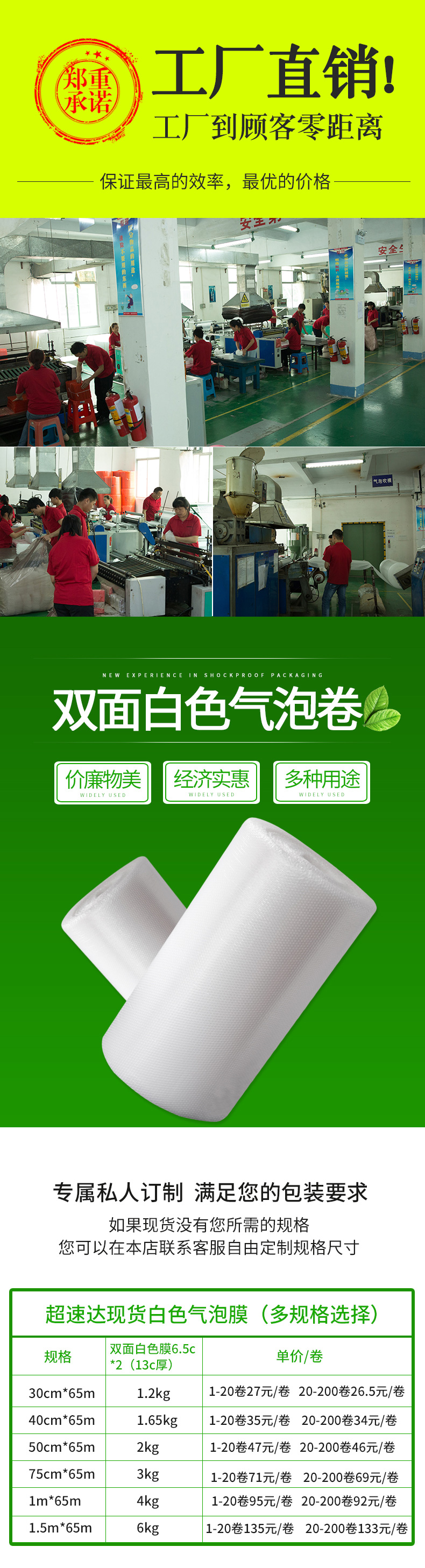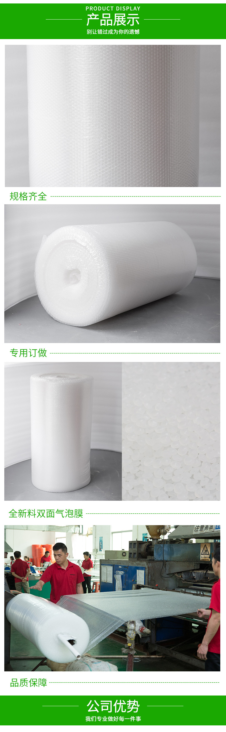 采用聚乙稀PE原料,經(jīng)擠出雙層膜真空復(fù)合成型的氣墊薄膜(簡稱氣泡膜),產(chǎn)品主要用于儀表、儀器、易碎、易損物品的防震包裝及電子行業(yè)、食品、工藝品、五金、注塑件、日用品等行業(yè)的減震包裝,可生產(chǎn)單面、雙面氣泡卷材、成型袋,小泡φ5MM,普通中泡φ8MM,并可生產(chǎn)達(dá) φ30MM的超大氣泡膜,可生產(chǎn)防靜電氣泡袋,復(fù)合多種膜料的氣泡墊,以上產(chǎn)品均可著色。氣泡卷、氣泡膜、單面氣泡袋、雙面氣泡袋、加厚氣泡袋、紅色氣泡袋、白色氣泡袋、防靜電氣泡袋。