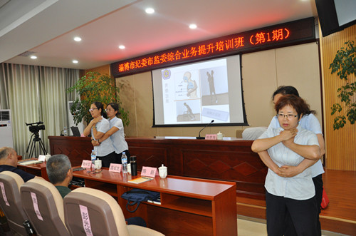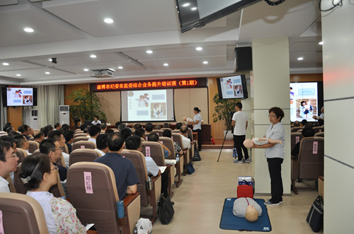 劉彥導師為培訓班的紀檢監(jiān)察干部講解了快速識別心梗和卒中、氣道梗阻解除術以及單人成人徒手心肺復蘇和AED的使用,五名志愿者配合進行了現(xiàn)場操作演示。